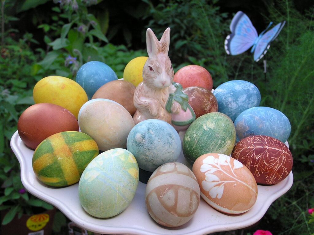 Dyeing eggs with natural dyes is equally as memorable as dyeing with chemical dyes, however natural dyes give eggs a much more subtle, but nonetheless gorgeous, coloring. Dyeing with natural dyes may be even more memorable for children because the warm colors come from materials they’re familiar with in their day-to-day lives; red and yellow onion skins, beets, turmeric, red cabbage, and coffee to name a few.